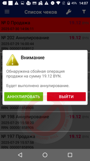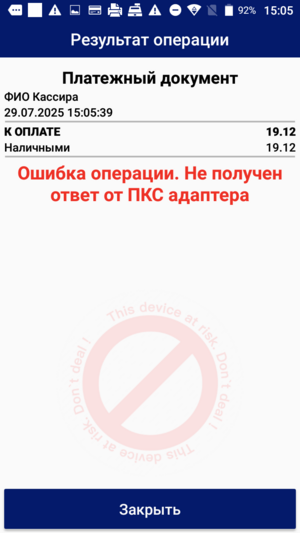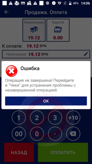 Иногда при проведении продажи могут возникать нештатные ситуации, о чем будет отображено на экране Результат операции.