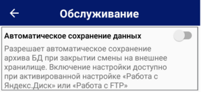 Разрешает автоматическое сохранение архива БД при закрытии смены на внешнее хранилище.