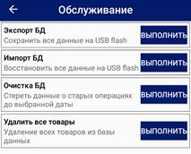При работе устройства все настройки, параметры, товары, чеки, смены сохраняются во внутренней базе данных (БД) устройства. Для того чтобы иметь возможность восстановления данных на устройстве при его поломке, перенесения данных на другое устройство доступны операции сохранения (экспорт) БД на внешний USB-накопитель, Яндекс.Диск или FTP, восстановления (импорт) БД, очистки БД, удаления товаров из БД.