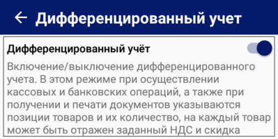При включённом режиме в кассовых операциях учитывается товарная база. Режим дифференцированного учёта позволяет работать с базой данных товаров при выполнении кассовых операций и формировании кассовых документов, а именно: