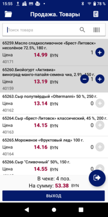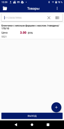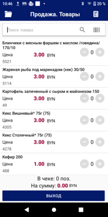 Для добавления товара в чек при помощи штрих-кода значение штрих-кода искомого товара может быть введено вручную в поле поиска или отсканировано с этикетки товара при помощи сканера.