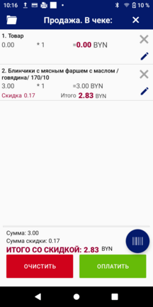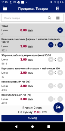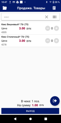 При просмотре списка товаров в начале списка будет доступна позиция с названием «Товар» и кодом «-1». При нажатии на «+» товар добавится в чек. Наименование, количество товара и его стоимость редактируются в электронном чеке.