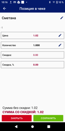 Для редактирования необходимо нажать на экране «Продажа. В чеке» символ карандашика напротив позиции. При этом откроется другой экран «Позиция в чеке». На этом экране можно изменить наименование «Товар», установленное по умолчанию, изменить цену, количество, начислить скидку.