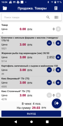Отобразиться окно «Продажа.Товары» со списком товаров, добавьте нужное количество товара в чек кнопками «-» и «+» в строке товара.