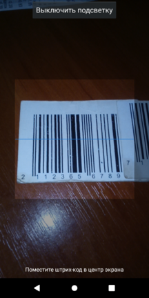 Наведите считыватель на штрих-код товара таким образом, чтобы код попадал в рамку, изображённую на экране zPOS.Терминала, и немного подождите, пока код будет отсканирован и добавлен в поле поиска.