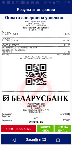 Экран с электронным вариантом чека автоматически закрывается по истечении 4 секунд. Для просмотра электронного варианта чека откройте меню «Чеки».
