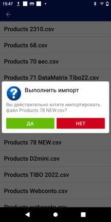 Если необходимо выбрать другой файл для импорта в сообщении нажмите "Нет" и вновь отобразится весь список товарных справочников загруженных на внешнее хранилище. Выберите новый товарный справочник и повторите импорт.