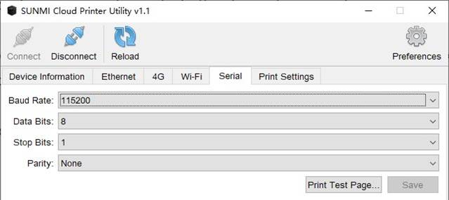 Принтер поддерживает печать через последовательный порт. Настройки последовательного порта по умолчанию: