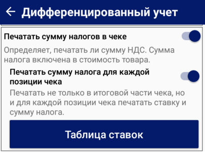Включение/выключение режима печати помимо итоговой части чека ставки и суммы налога для каждой позиции чека.