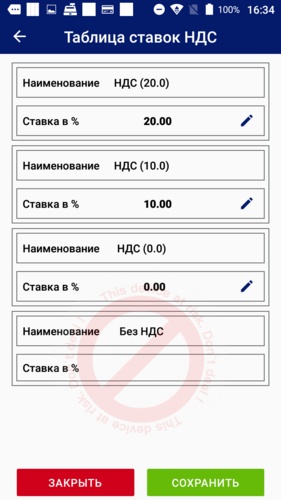 Для каждой позиции определяется наименование, например, «НДС (10%)», - текст, отображаемый в финансовых документах, в т.ч. на чеке и значение (поле «Ставка в %»)