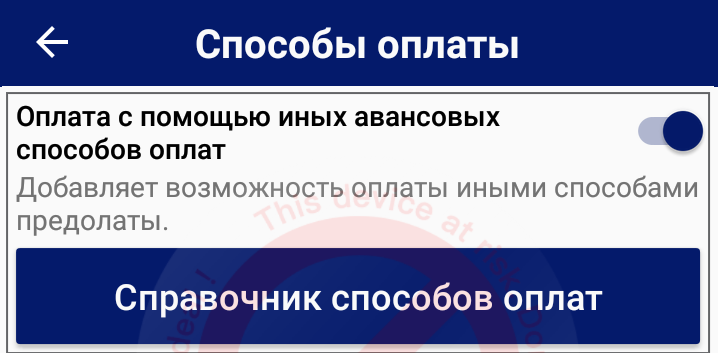 Добавляет возможность оплаты иными способами предоплаты. На экране «Параметры» включите пункт «Оплата с помощью иных способов авансовых оплат» и после этого появится кнопка «Справочник способов оплат».