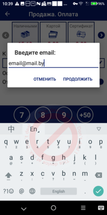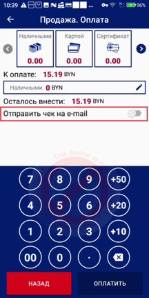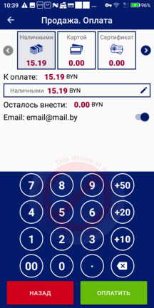 Также операция «Чек на email» доступна на экране «Результат операции» в виде отдельной кнопки «Чек на email». Данная кнопка доступна только в результате операции продажи.