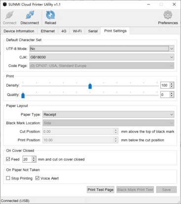 На странице «Настройки печати/Print Setting» вы можете установить набор символов по умолчанию, плотность и качество печати, макет бумаги и т. д.