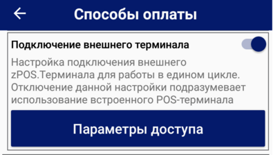 Добавляет возможность использовать оплату по банковской карте на интегрированном терминале в едином цикле. Отключение данной настройки подразумевает использование встроенного или сопряжённого POS-терминала.