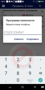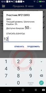Ввести в поле «Списать бонусы» можно только целое число. После ввода значения необходимо нажать кнопку «Продолжить». На товары в чеке будут применены скидки, примененное значение можно увидеть под позицией в чеке после слова Скидка.