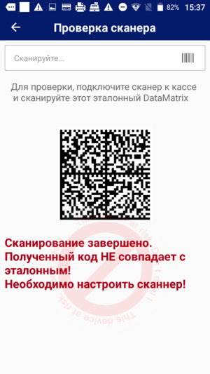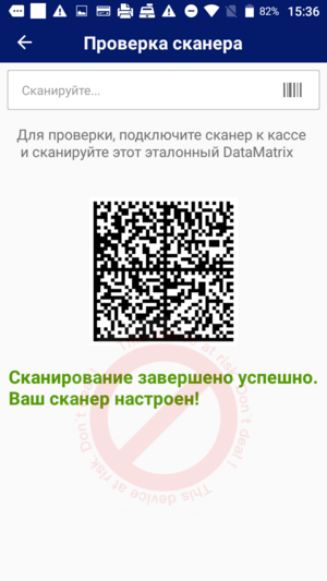 На экране будет отображен QR. Подключите внешний сканер к устройству и отсканируйте эталонный DataMatrix изображенный на экране устройства.