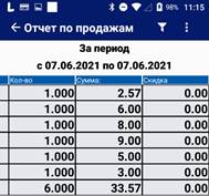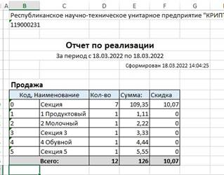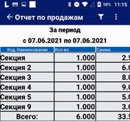 Реализация в разрезе секций Нажмите кнопку «Реализация в разрезе секций». На экране будет сгенерирован отчёт по продажам (с учётом возвратов) товаров за выбранный период. По умолчанию - за последнюю смену.