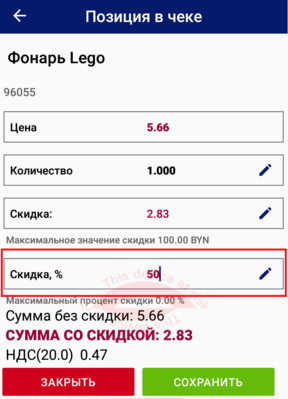 В поле «Скидка %» можно ввести число от 0.01 до 99.99.