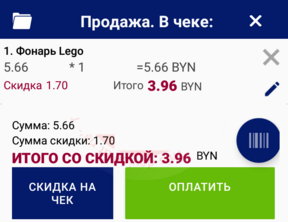 Установленные скидки в справочнике товаров на каждый конкретный товар будут применены автоматически и дополнительно возможно добавить скидку по дисконтной карте на весь чек.