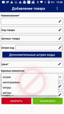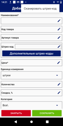 После этого включится встроенный в устройство сканер штрих-кода, наведите на значение штрих-код товара и оно автоматически запишется в поле "Штрих-код".