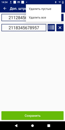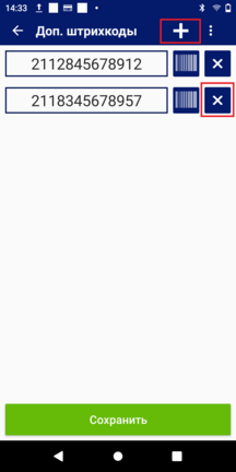 На открывшемся окне "Доп. штрихкоды" нажмите кнопку с + вверху экрана для добавления еще одного пустого поля для ввода штрих-кода. Для запуска встроенного сканера нажмите кнопку