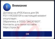 УНП, указанный в настройках кассы, не совпадает с УНП, указанным в договоре на zPOS.Касса. Обратитесь в СООО "ЭКСАТ-БЕЛ". Контакты для связи на сайте https://zpos.by
