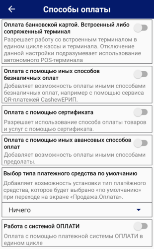 Добавляет возможность оплаты иными способами безналичных оплат. Дополнительно необходимо добавить наименование способа безналичного платежа в меню «Справочник способов оплат».