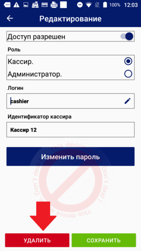 Для удаления пользователя zPOS. АРМ Кассира: