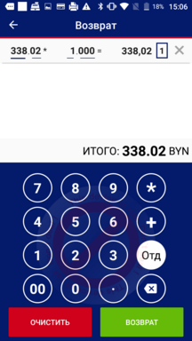 На появившемся экране «Возврат. Оплата» введите сумму возврата по карте. Для ввода суммы используйте цифровую клавиатуру. При вводе суммы возврата, превышающей сумму чека, отображается сообщение «Сумма возврата не должна превышать сумму чека».