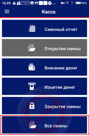 В подменю «Касса» выберите пункт «Все смены». Откроется экран «Все смены», содержащий список закрытых смен.