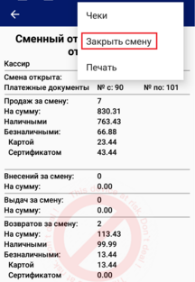 Также есть возможность закрыть смену через боковое меню Сменного отчета.